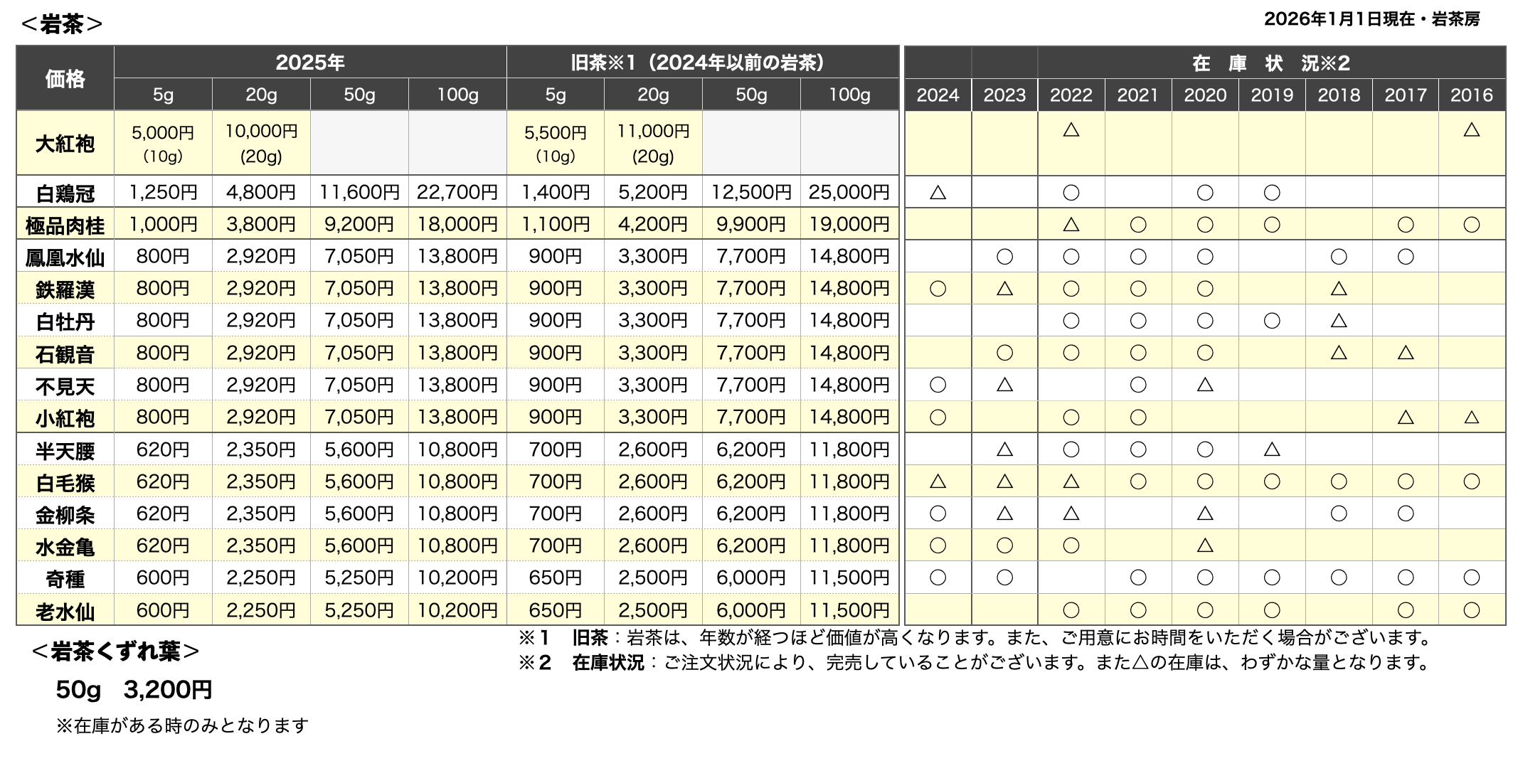 岩茶の価格表